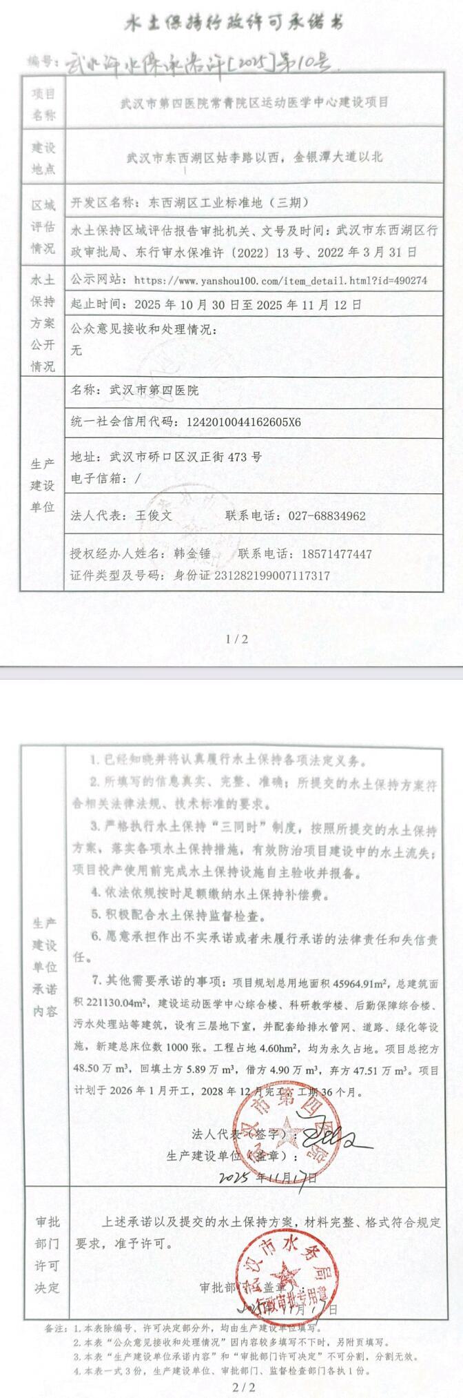 武汉市第四医院常青院区运动医学中心建设项目水土保持行政许可承诺书 武水许水保承诺许〔2025〕10号