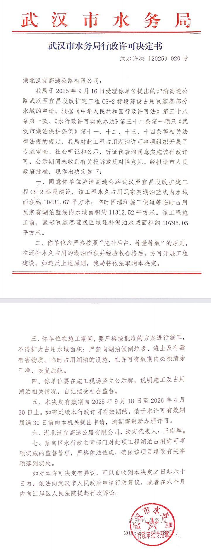 湖北汉宜高速公路有限公司行政许可决定书 武水许决〔2025〕第020号