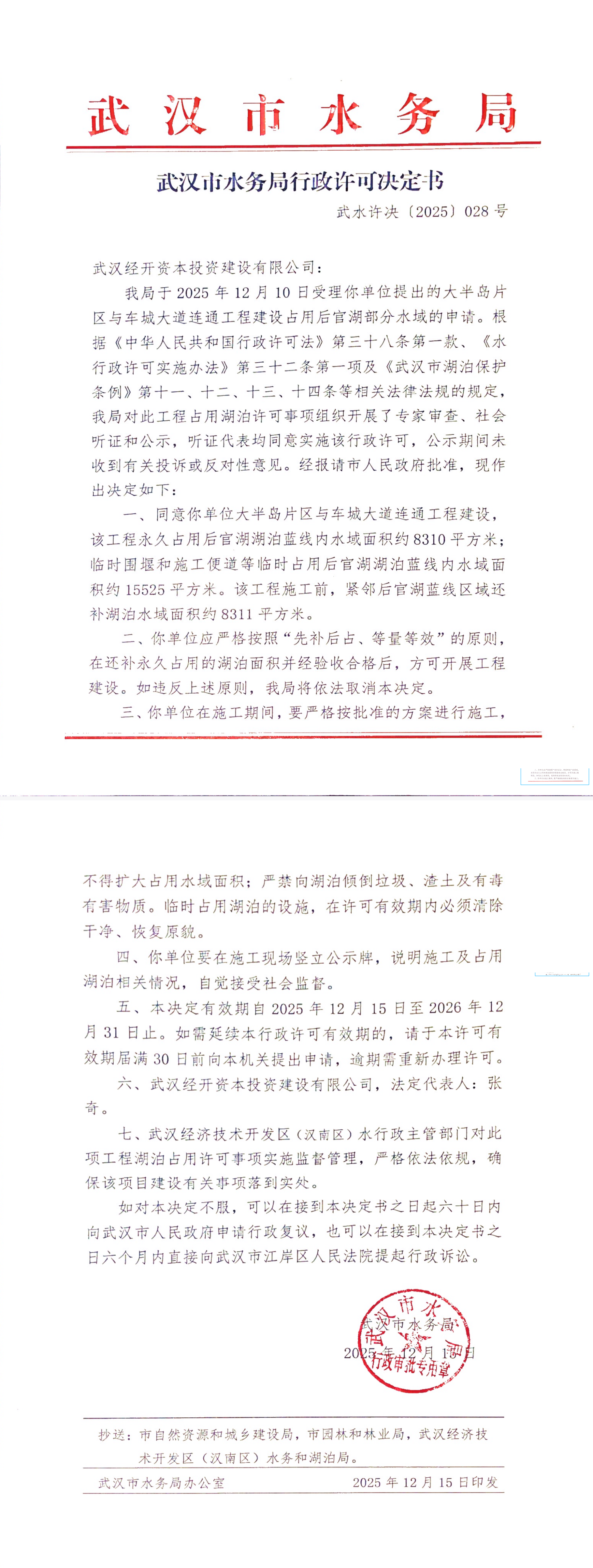 武汉经开资本投资建设有限公司行政许可决定书 武水许决〔2025〕第028号