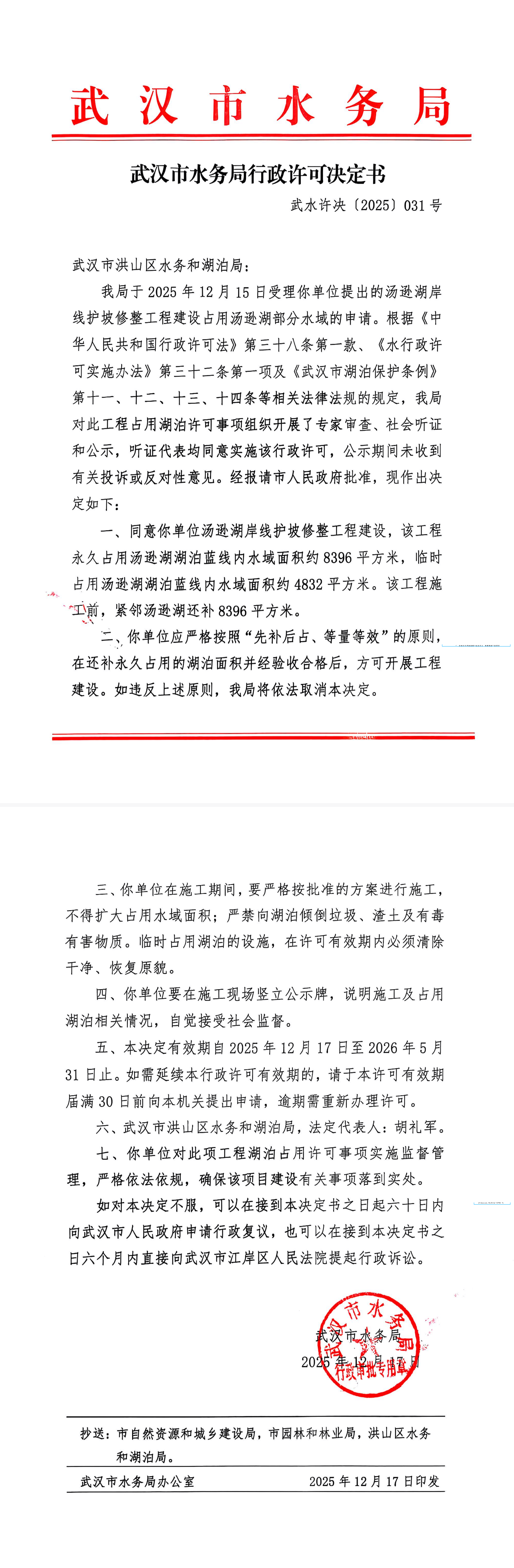 武汉市洪山区水务和湖泊局行政许可决定书 武水许决〔2025〕第031号