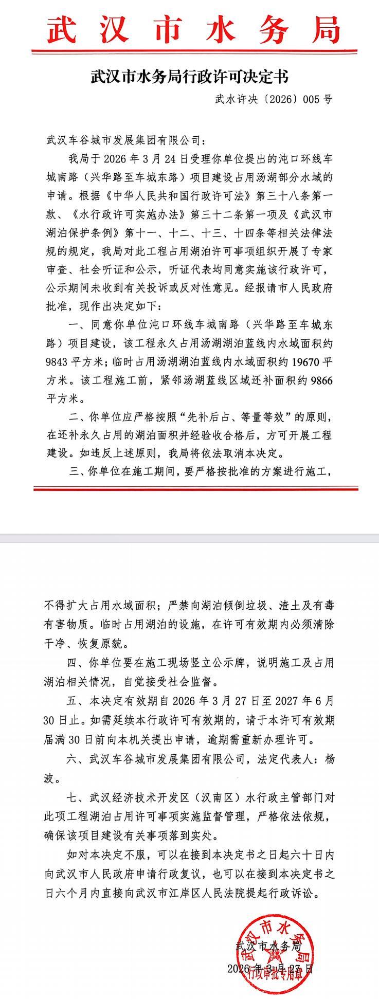 武汉车谷城市发展集团有限公司武水许决〔2026〕第005号
