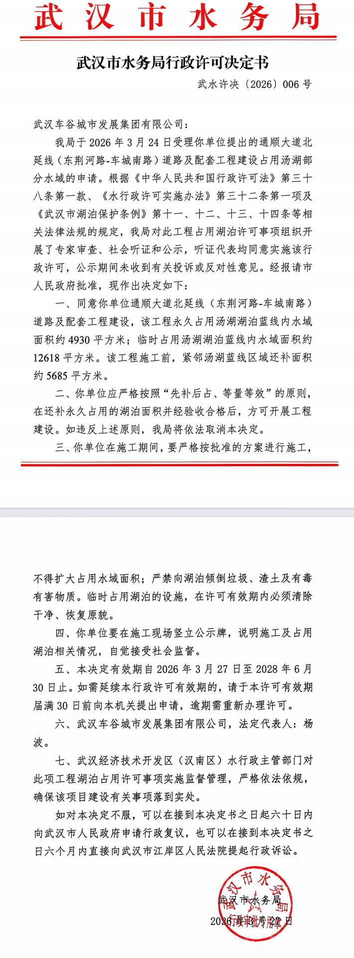 武汉车谷城市发展集团有限公司武水许决〔2026〕第006号