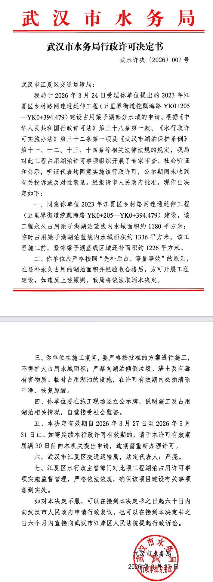 武汉市江夏区交通运输局武水许决〔2026〕第007号