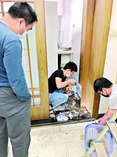 为了避免自来水渗漏到楼下更多住户家中,邻居们联系居委会,关掉了单元楼水阀。吴女士说,这栋单元楼里住着不少老人,停水之后大家都很着急,微信群里都关心着6楼家中的水管修复情况。晚上11时30分左右,有人拨打了市水务集团抢修热线96510,很快,市水务集团就派出了陈师傅和杨师傅赶到现场。