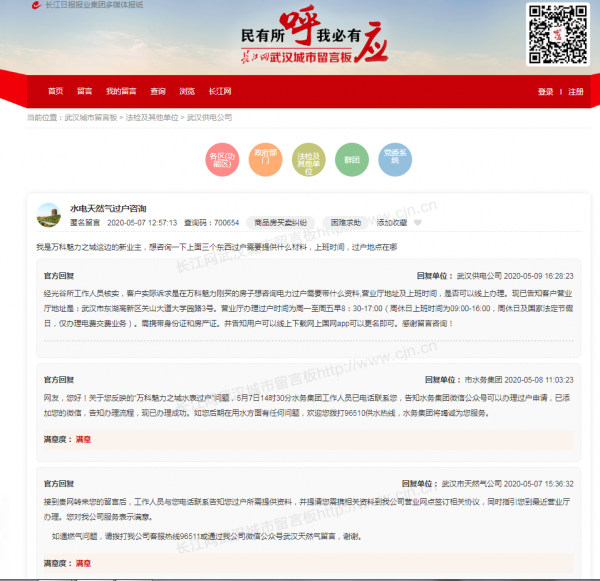 长江日报-长江网5月12日讯(记者孙笑天)“留言一次,三家单位都回了电话,他们详细解释政策、告知办理流程,服务很贴心,我非常满意。”近日,市民杨先生在长江网武汉城市留言板留言咨询水电气过户问题,引来武汉供电公司、市水务集团、武汉市天然气公司三家单位“抢答”。