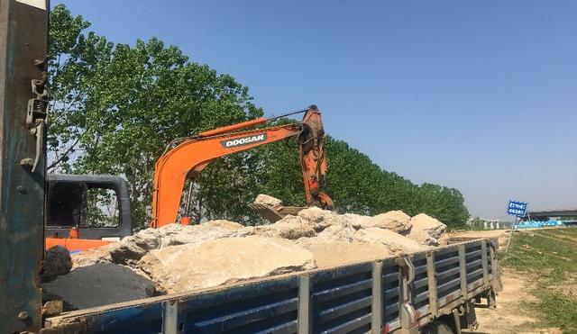 4月15日上午9点,记者来到府河的武汉市东西湖段。李家墩河道堤防管理所所长陈和启正在指挥操控挖掘机的工人刨开破损的堤坝顶部路面,将石块运走。
