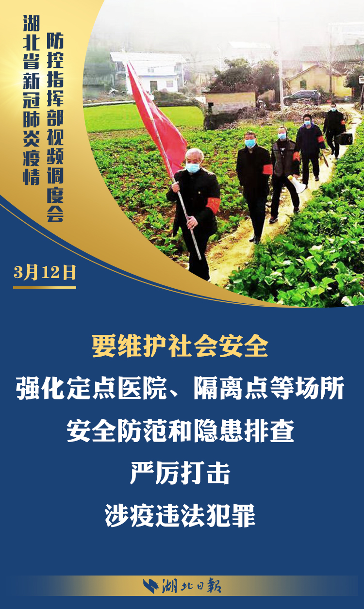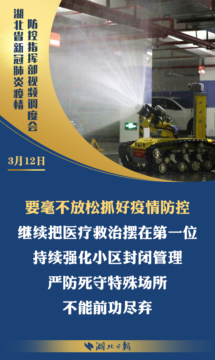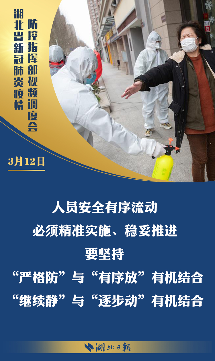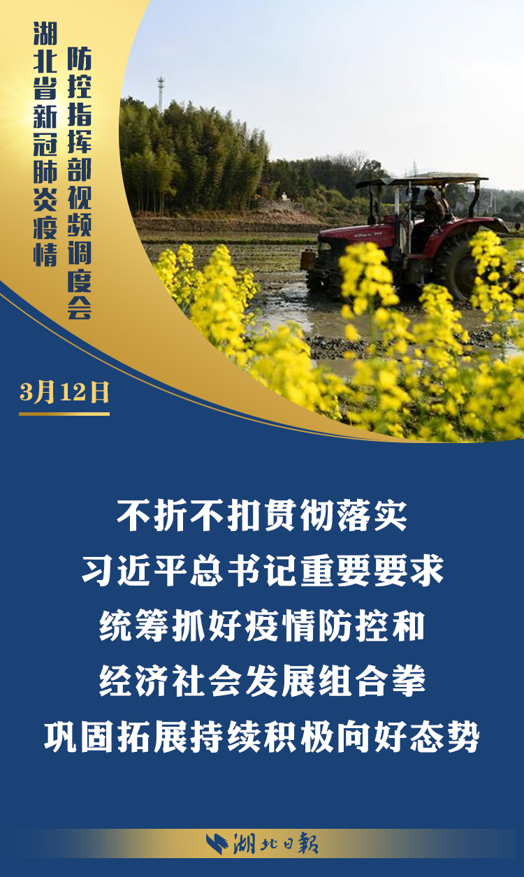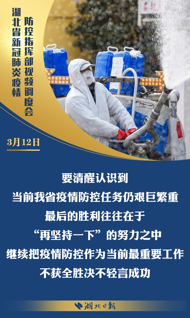 3月12日上午,省新冠肺炎疫情防控指挥部召开视频调度会,深入学习习近平总书记考察湖北重要讲话精神,传达省委常委会扩大会议意见,部署统筹推进全省疫情防控和经济社会发展工作。省委书记、省防控指挥部指挥长应勇出席会议并强调: