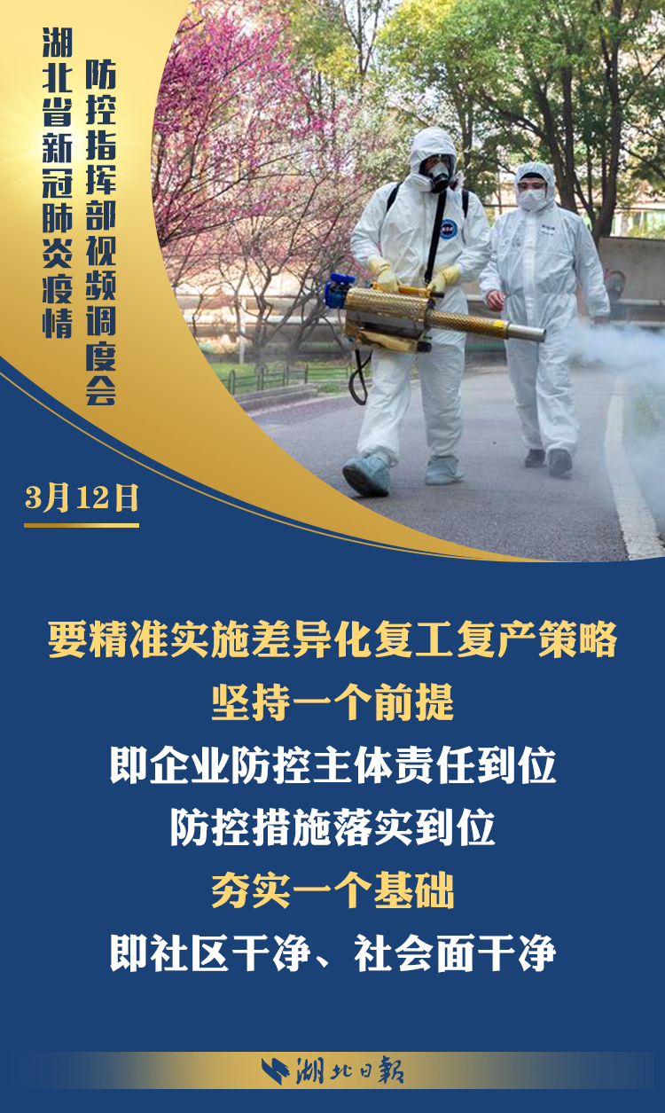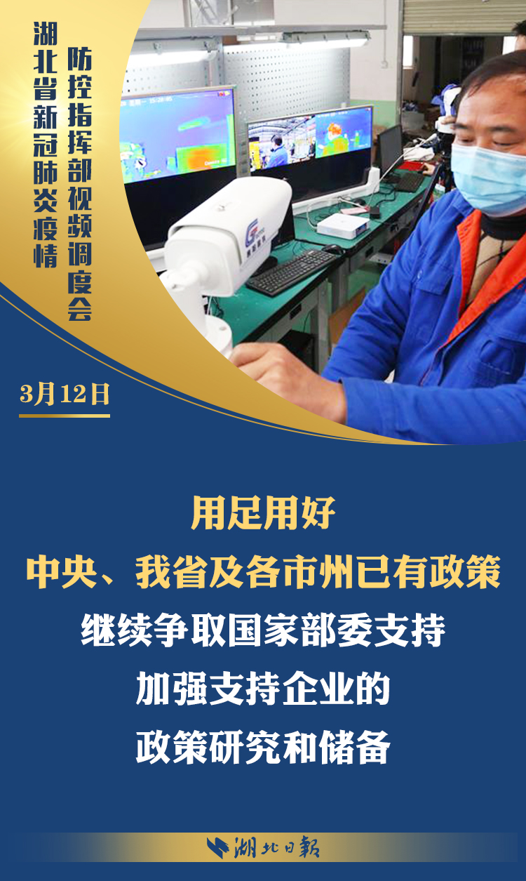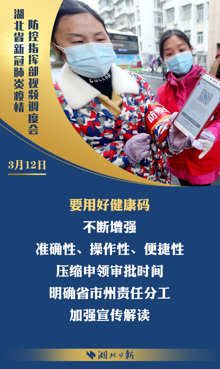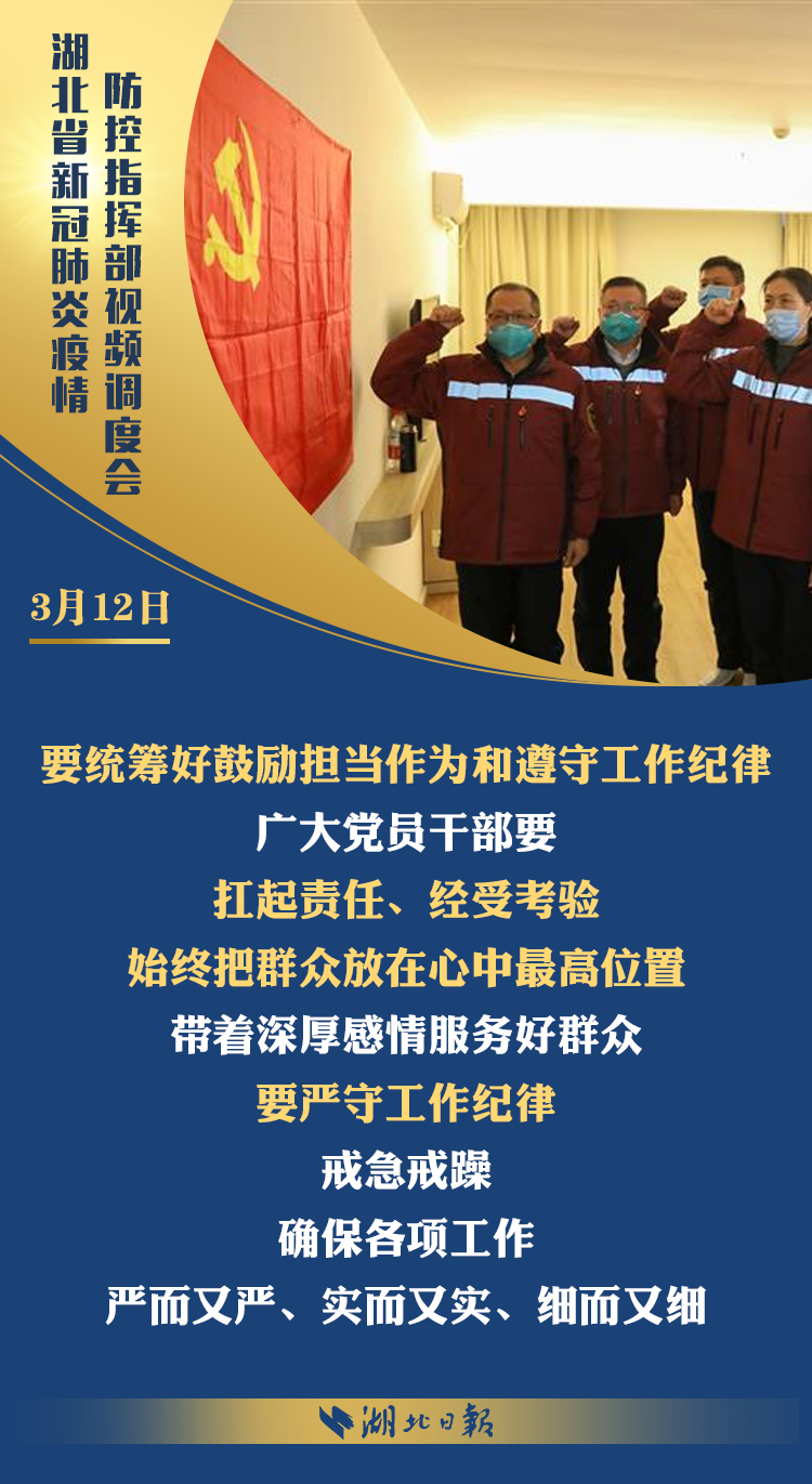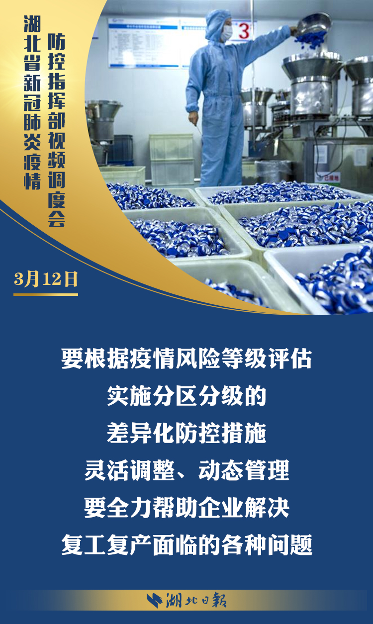 3月12日上午,省新冠肺炎疫情防控指挥部召开视频调度会,深入学习习近平总书记考察湖北重要讲话精神,传达省委常委会扩大会议意见,部署统筹推进全省疫情防控和经济社会发展工作。省委书记、省防控指挥部指挥长应勇出席会议并强调: