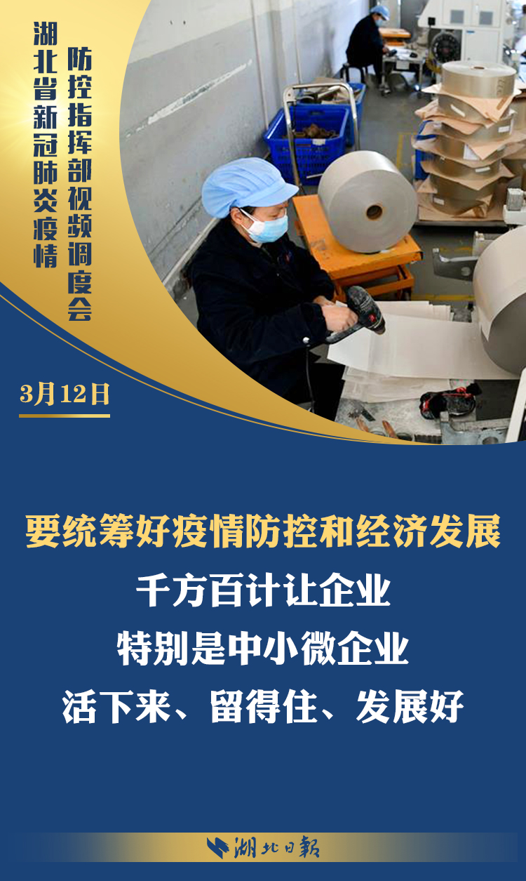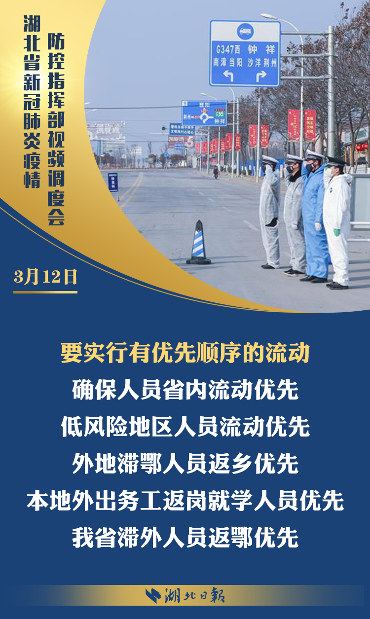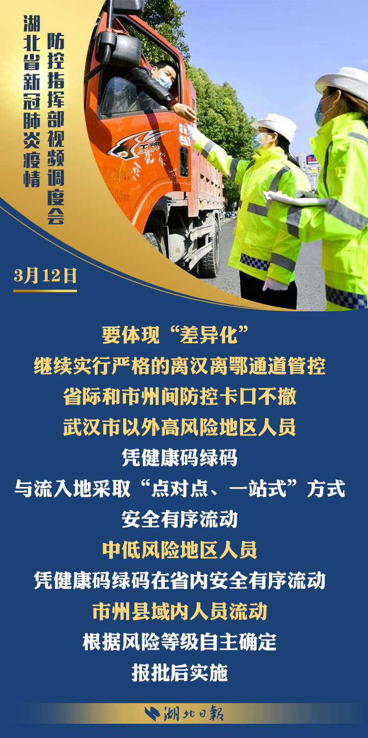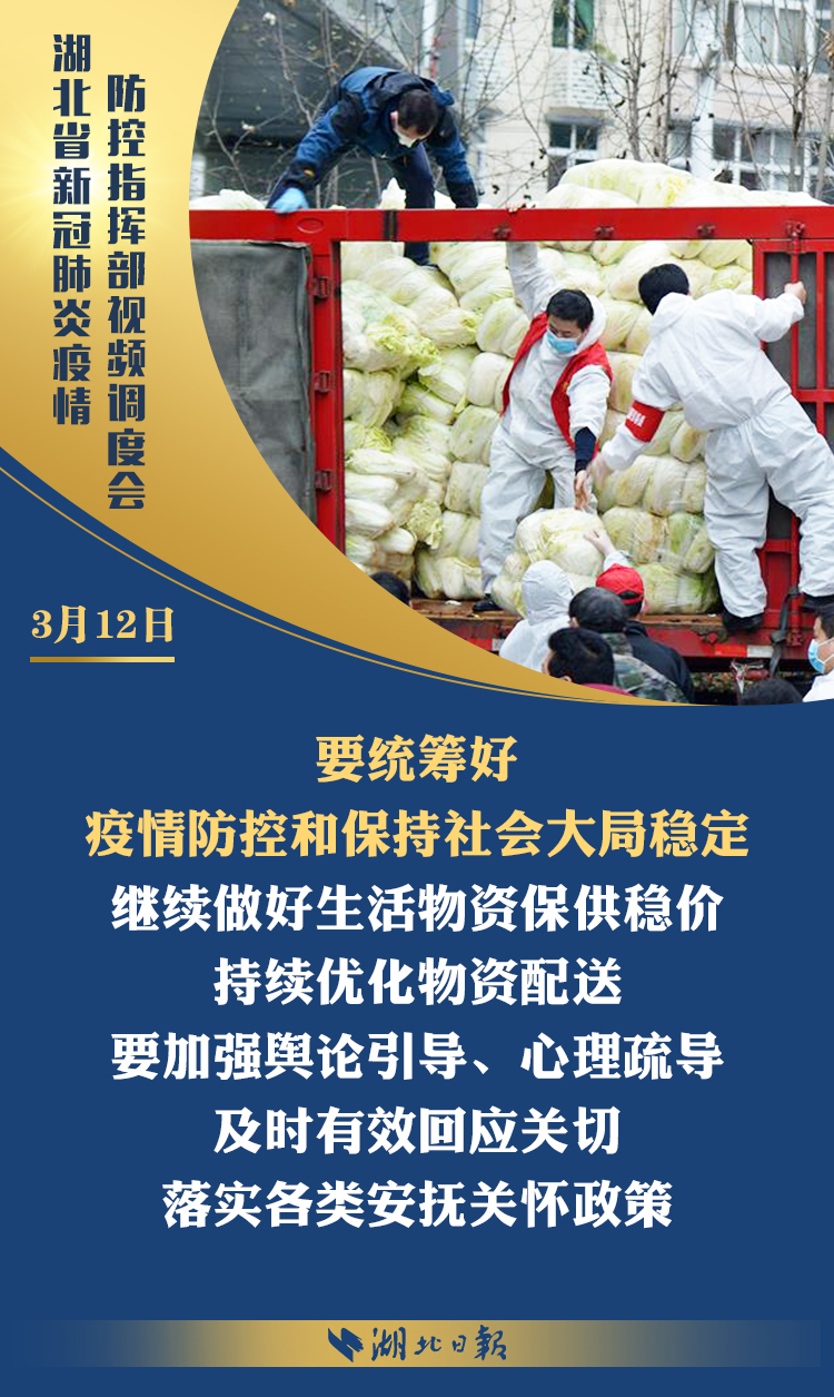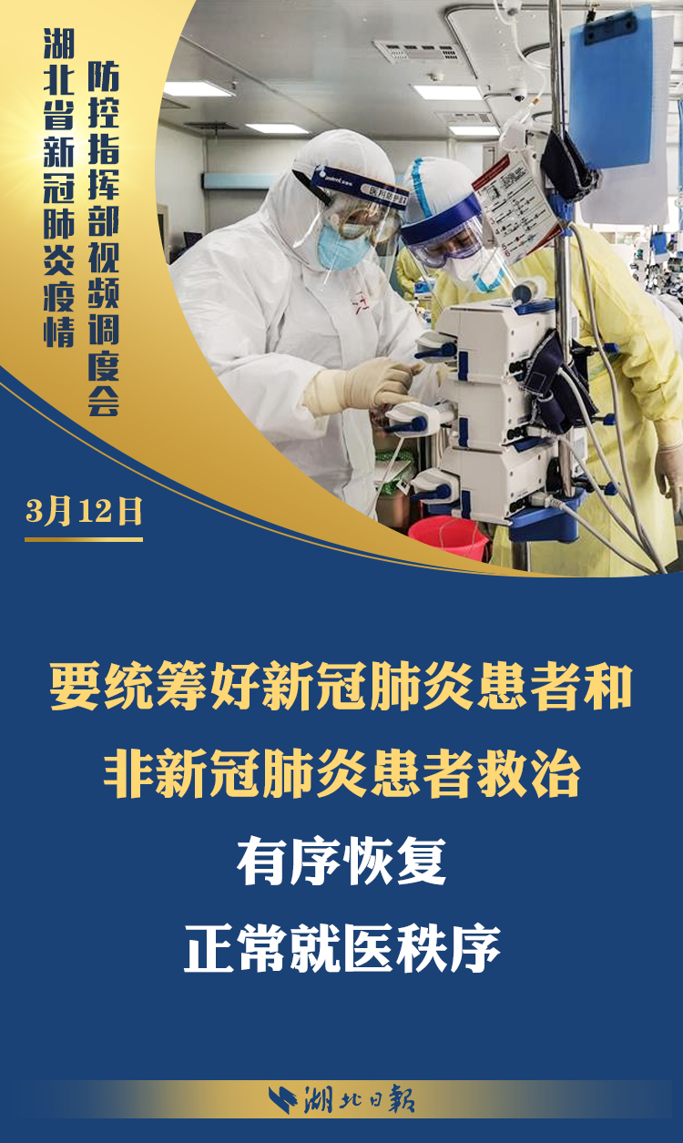 3月12日上午,省新冠肺炎疫情防控指挥部召开视频调度会,深入学习习近平总书记考察湖北重要讲话精神,传达省委常委会扩大会议意见,部署统筹推进全省疫情防控和经济社会发展工作。省委书记、省防控指挥部指挥长应勇出席会议并强调: