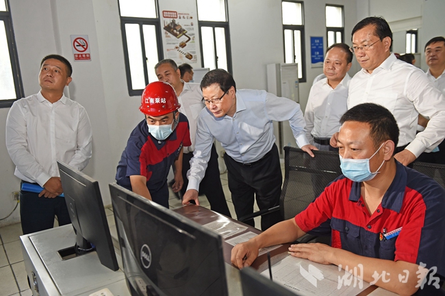 江南泵站与汤逊湖泵站一起,承担整个汤逊湖水系458平方公里的雨水外排任务,区域雨水通过管网收集后,由江南泵站抽排出江。泵站内机器轰鸣,排水泵机组正抓紧抽排。应勇察看泵站运行情况,仔细询问抽排流量、出口水位等数据。他强调,要全力保障城市泵站涵闸等防洪排涝设施平稳运行,确保安全度汛;要规划建设好城区涵闸泵站体系,既要保障汛期排涝,又要满足缺水抗旱、调剂湖泊生态等多种需求。