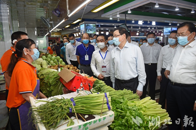 入汛以来,群众生活必需品的市场供应是否充足,价格是否稳定?应勇走进武昌区大成生鲜市场,与摊主和前来买菜的市民交流,察看市场检测室,详细了解货源组织、品种供应、价格波动、食品安全等情况。应勇强调,汛期持续降雨可能会对市场供应带来一定影响,各级党委政府要全力抓好“米袋子”“菜篮子”,加强群众生活必需品供应,确保市场供应充足、价格稳定、秩序良好;要通过财政补贴、采购爱心扶贫菜等方式,常态化组织销售平价蔬菜,平抑大宗菜价;要加大农残等检测力度,让群众吃得安心。