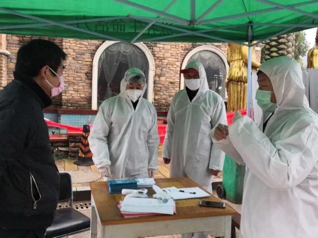 △ 市大军山泵站管理处设立测量体温点,统计、追踪社区居民健康情况