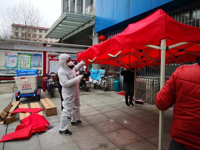 △ 市江滩办帮助社区搭建帐篷,为社区送去防护服、口罩、84消毒水等防疫物资