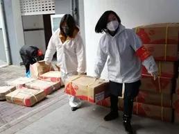 △ 市堤建中心为社区送上医用口罩、面包等物资