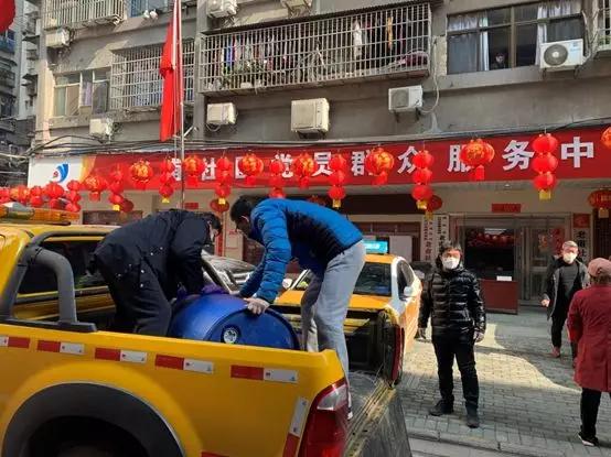 △ 江夏区水务和湖泊局向社区赠送消毒液等物资,并协助社区为居民送上消毒用品和体温测试仪器