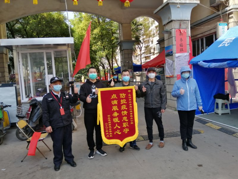 3月20日,市水务局局机关与江滩办党员干部下沉的阳光花园全体业主委派代表为下沉党员送上一面“防控疫情终值守 点滴服务暖人心”的锦旗,感谢下沉党员干部为小区疫情防控付出的巨大努力。下沉党员代表接过锦旗,热情邀请小区居民等到战“疫”取得全面胜利之后来江滩做客,共赏江滩美景、繁花锦簇。