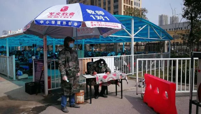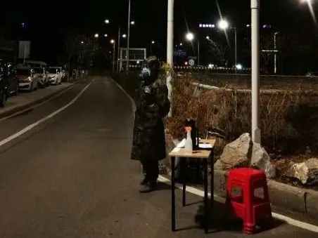 2月15日,江城遍地大雪纷飞,气温骤降,路上几乎没有行人。在新华家园小区出入口处,石海林正在为居民测量体温,全身已落满积雪,身体不由自主在打冷颤,在这样的环境中,他已经站了近6个小时。