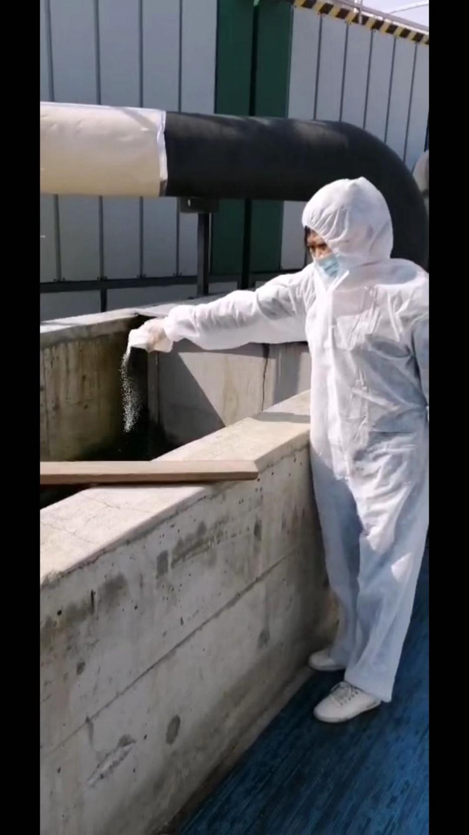 1月31日,武泰闸分散污水处理厂按照防疫布控的要求对尾水抛撒单过硫酸氢钾消毒粉。