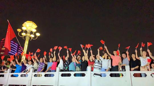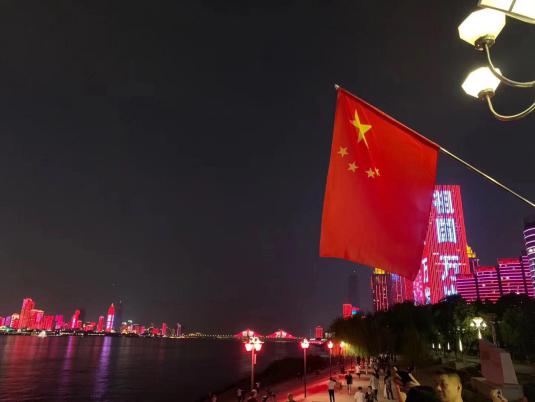 配合灯光秀拍摄。为热烈庆祝中华人民共和国成立70周年,营造浓厚喜庆的节日氛围,9月25日至29日,央视进入三地江滩开展两江四岸灯光秀拍摄工作。9月25日,无人机在武昌江滩进行拍摄,两江四岸华灯璀璨,以“楚天光秀 辉煌江城”为主题的灯光秀表演包括国风楚韵、浩荡长歌、辉煌时代三个篇章,涵盖庆祝建国70周年、军运会等元素,呈现气壮山河、万象更新的华彩画卷。大批市民群众来到江滩,手持五星红旗,合唱国歌,表达对祖国母亲繁荣昌盛的真挚祝福。