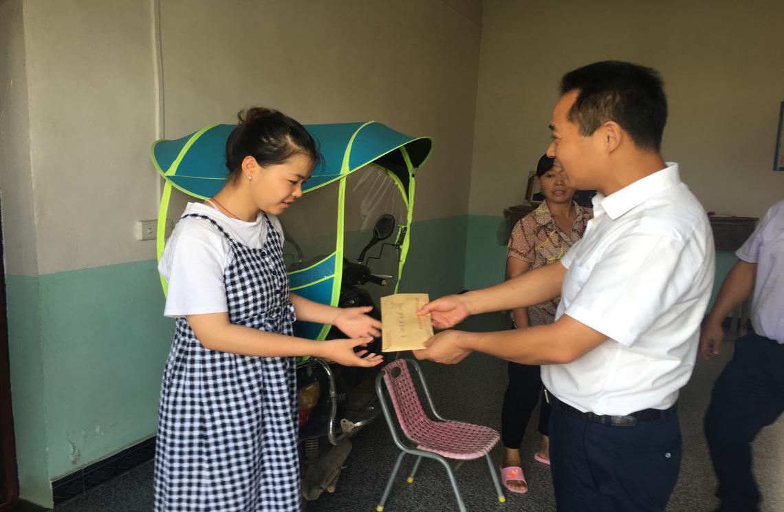 8月15日下午,江夏区河道堤防管理总段驻村工作队为贫困户王芳一家送去六千元学费,帮助贫困学生完成大学学业。