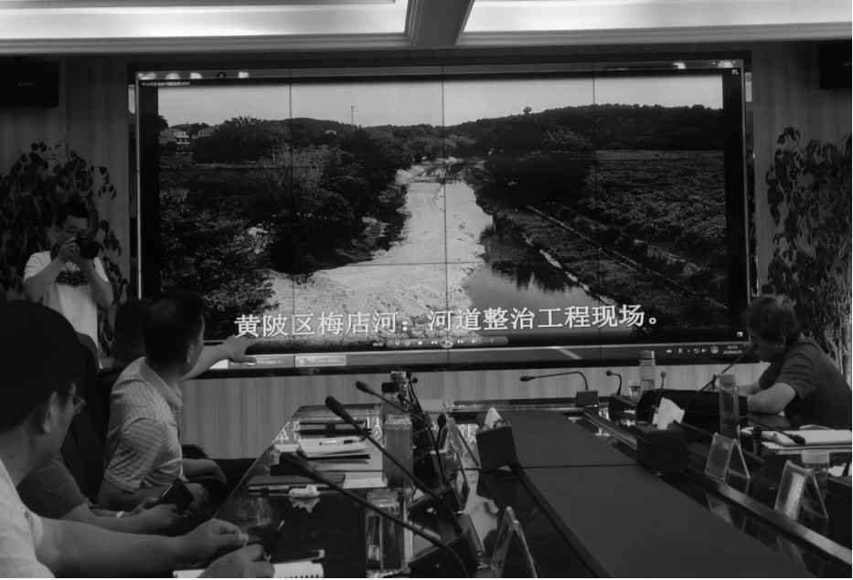 参会人员首先实地查看了梅店河清淤整治工程现场,沿线巡查了梅店河河道疏浚、岸坡整治、泥沙堆场几个典型点位,在黄陂区水务和湖泊局召开了专题会议。5月30日,湖北省常态化电视问政节目《党风政风前哨》曝光了黄陂区梅店河借河道疏浚之名进行疯狂非法采砂的问题。会上播放了市水务执法总队采集的梅店河清淤整治工程施工现场视频及黄陂、新洲两区中小河流河道采砂相关影像;黄陂区汇报了梅店河清淤整治工程基本情况及其它中小河流涉砂管理情况;新洲区汇报了中小河流河道采砂管理情况;黄陂区政府分管领导表示:一是黄陂区政府将进一步加强河道采砂管理工作的组织领导,建立完善长效管理机制,及时补齐短板。二是积极做好梅店河非法采砂曝光后的整改工作,立行立改,确保措施落实落地见效。三是严格按照年度重点工作清单完成目标任务,积极推进长江岸线清理整治和河道采砂管理执法能力建设。