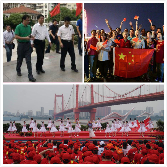 10月2日晚,数以万计的市民群众选择在江滩欢度国庆,与亲朋好友共赏“万里长江第一秀”。长江两岸楼宇幕墙逐秒闪现倒计时数字,当倒计时完成,长江两岸的楼宇幕墙上出现飘扬的69面国旗,庆祝新中国69周年华诞。长城、华表等符号依次出现,祝福祖国繁荣昌盛——动画作品《国庆礼赞》为当晚的“梦幻江城”灯光秀拉开序幕。当晚的武汉华灯璀璨,两江四岸,一组组饱含深情的灯光大声的说出:“我爱你,中国!”欢呼声、掌声和《我爱你中国》的悠扬乐声交相呼应,出现在央视航拍视角下的武汉江滩令人心醉。横渡长江博物馆古典的八角楼外形在金黄色灯光照耀下熠熠生辉,成为长江沿线最吸睛的地标性景观之一,八角楼上不少市民群众脸绘国旗图案,手持五星红旗,为祖国歌唱,祝福祖国繁荣昌盛。