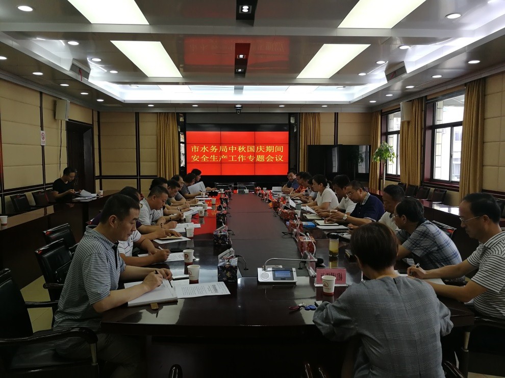 为切实做好中秋节、国庆节(以下简称“两节”)期间安全生产工作,认真贯彻落实党中央国务院、省委省政府、市委市政府关于加强当前安全生产工作的要求和省水利厅、市安委会关于切实加强中秋国庆期间安全生产工作的通知精神,有效防范和遏制各类安全事故发生,消除安全隐患,确保全市水务系统平安、有序和稳定。9月20日下午,由市水务局程建军副局长在局五楼大会议室,召集局机关相关处室和局属各单位主要负责人召开安全生产专题会议,传达上级安全生产会议精神和要求,安排和布置“两节”期间安全生产工作。