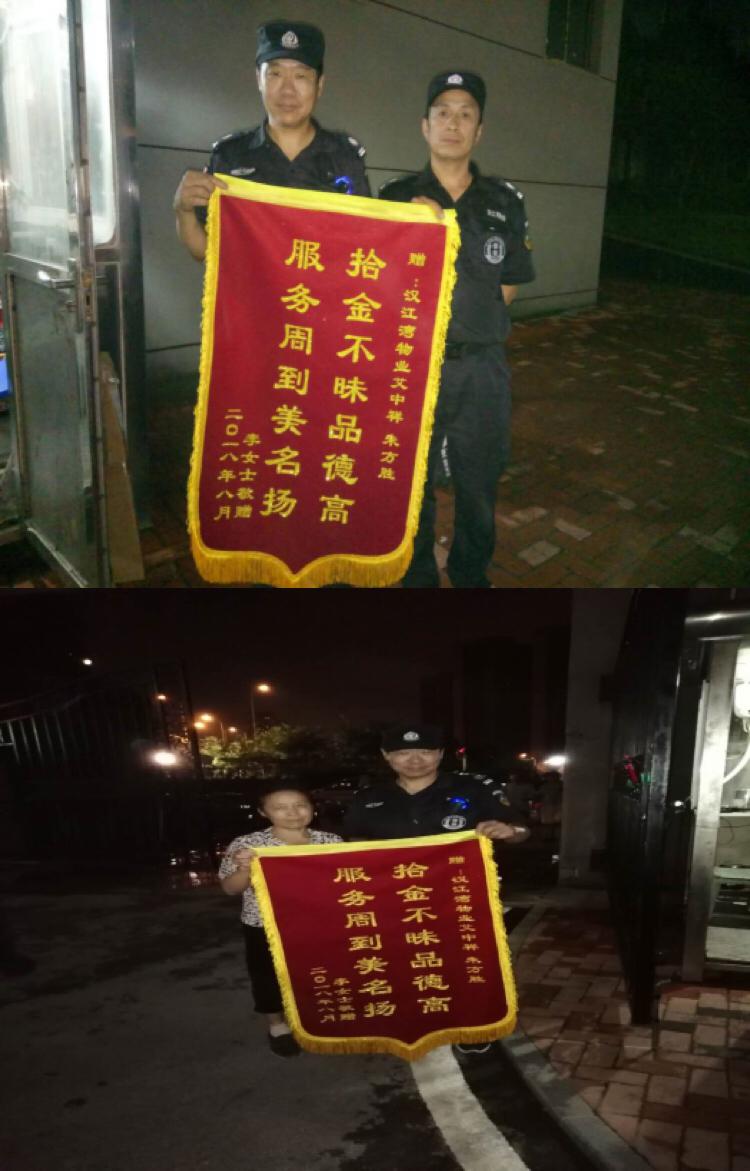 8月13日晚19时,汉江湾体育公园工作人员艾中祥和朱方胜在古田二路闸口附近巡逻时,在花坛发现一个黄色手提包,内含华为手机一部,现金总计1160元。为防止物品丢失,两人将手提包放于岗亭处,等失主过来认领。当晚20时左右,一位老奶奶来岗亭处询问,经双方面核实后,物归原主。为表示感谢,失主李秋兰老人于2018年8月19日晚,特送来拾金不昧锦旗一面。