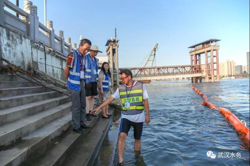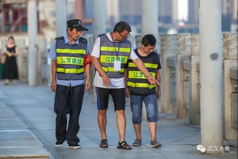 ↑江汉区堤防工作人员正在龙王庙长江大堤上查看
