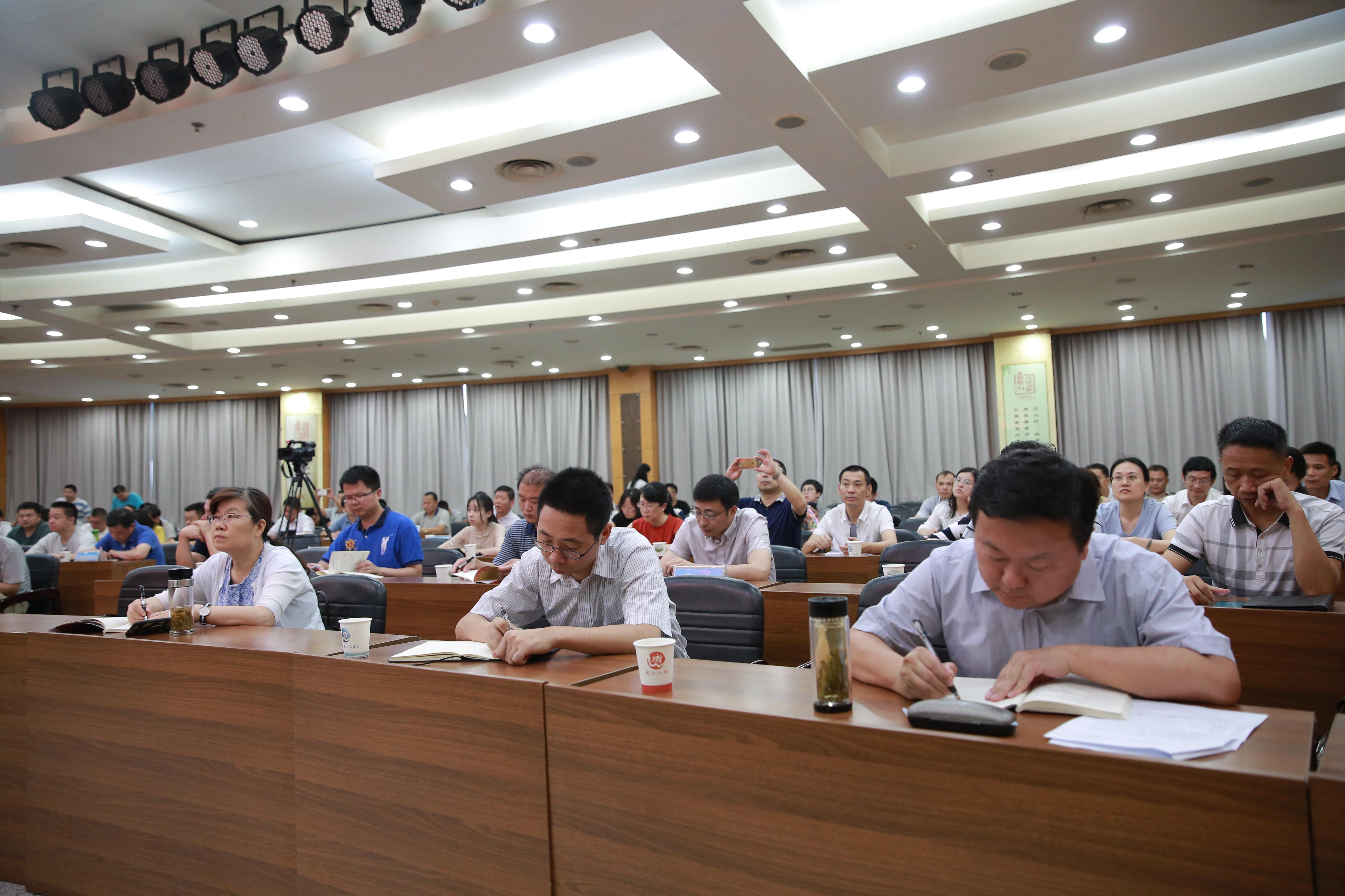 为深入学习贯彻习近平总书记视察湖北武汉重要讲话精神,6月19日,市水务局召开局党组理论学习中心组扩大学习报告会,邀请市级宣讲团成员,中共武汉市委党校、武汉行政学院哲学教研部主任、博士明庭权教授作题为《习近平总书记在湖北武汉重要讲话精神解读》的专题报告。报告会由市水务局河长办(四水办)主任昌先耀主持。局党组中心组成员,局机关全体干部,局属单位党政班子成员、支部书记、中层干部及党员代表共计160余人参加报告会。