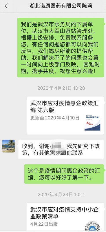 4月21日,市大军山泵站管理处与对接企业湖北诺康医药有限公司取得了联系,详细了解了企业目前存在的实际困难。由于疫情影响,该企业生产经营受挫较大,想申请适当减免仓库场租费用,并申请政府的业务扶持,使其产品能够进驻武汉各医疗机构。