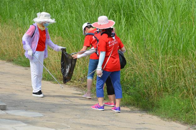 下午3点,50多名志愿者们迅速在汉口江滩大舞台下方的滩地集结。分发垃圾夹、垃圾袋、防护手套等工具后,身着红色文化衫的志愿者们迅速奔向绿色滩地,开始清理市民群众遗留在滩地的白色垃圾以及岸边的漂浮物。尽管下午天气炎热、骄阳似火,志愿者们仍热情不减,热火朝天地在滩地搜寻垃圾,有的志愿者为提高效率,直接用手一个个地将烟头捡拾干净。
