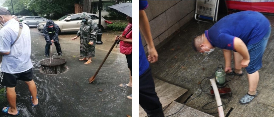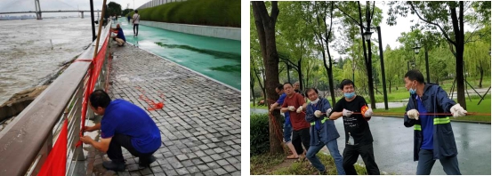 暴雨还在继续,战斗仍未停歇。忙碌了一整晚的水务战士并未喘口气、歇歇脚,立即投身下一场战斗。汉口江滩受强降雨影响,部分区域出现积水,江滩职工立即排查全园积水情况,调运沙袋、泵机,疏捞阻塞排水管网,及时实施排水工作。