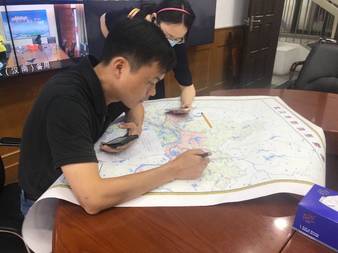 7月6日,全市接连启动城市排渍Ⅱ级响应和防汛Ⅱ级响应,至7月12日23时,长江汉口站水位达到历史第四高位。全市防洪设施隐患风险加大,急需完善更新制作高水位防洪隐患风险点分布图。市水务防汛信息中心领导班子带领核心技术人员第一时间组建攻坚团队,克服没有点位坐标、时间紧的困难,打印纸图,上门找专业人员图上作业标注,1天时间完成全市河道堤防30余处风险点和长汉江干堤200多处市级备料点位的上图。