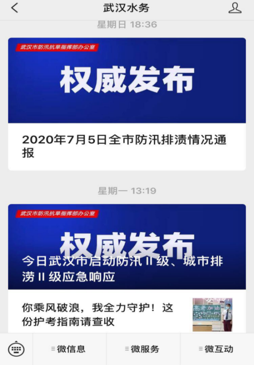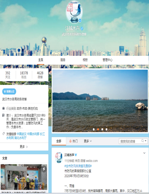 入梅以来,依托“武汉水务”微信公众号、“江城水声”微博、水务头条号及水务局官方网站四大新媒体载体,市水务防汛信息中心同步推出微信权威发布64篇、网站信息454条、微博275篇、头条号274篇;及时发布水情、雨情及渍情等民众关心的涉水信息,及时公开真实传播水务声音,引导舆论正风向,弘扬正风气,更好的树立新时代水务正能量;同时加强涉水相关舆情监控,及时发现、及时上报、分类整理,共收集整理5700余条涉水舆情,为舆情及时应对赢得主动。