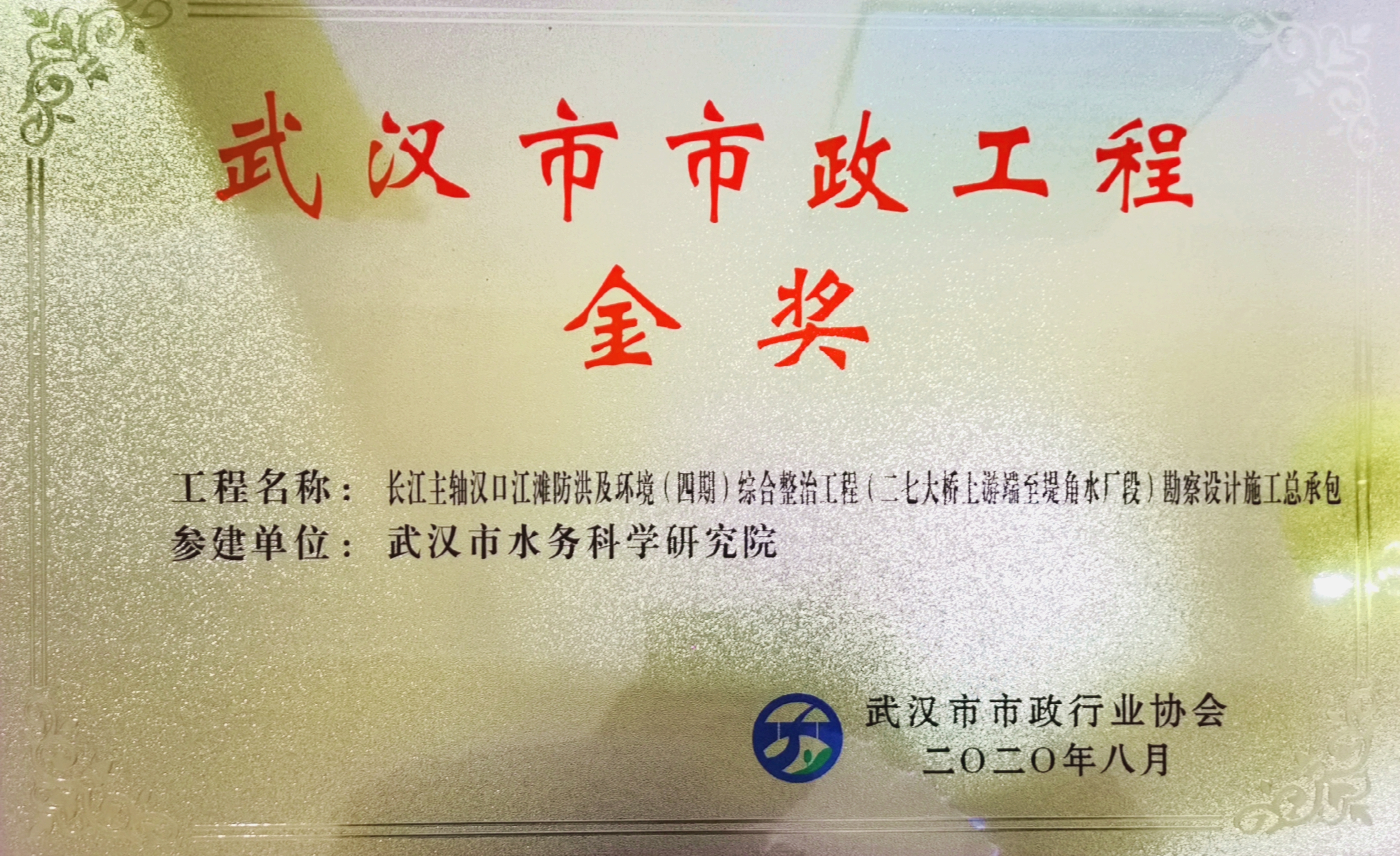 2020年11月26日,武汉市市政行业协会举行颁奖仪式,市水科院承担设计的长江主轴汉口江滩防洪及环境(四期)综合整治工程(二七大桥上游端至堤角水厂段)勘察设计施工总承包荣获2019年度武汉市市政工程金奖。