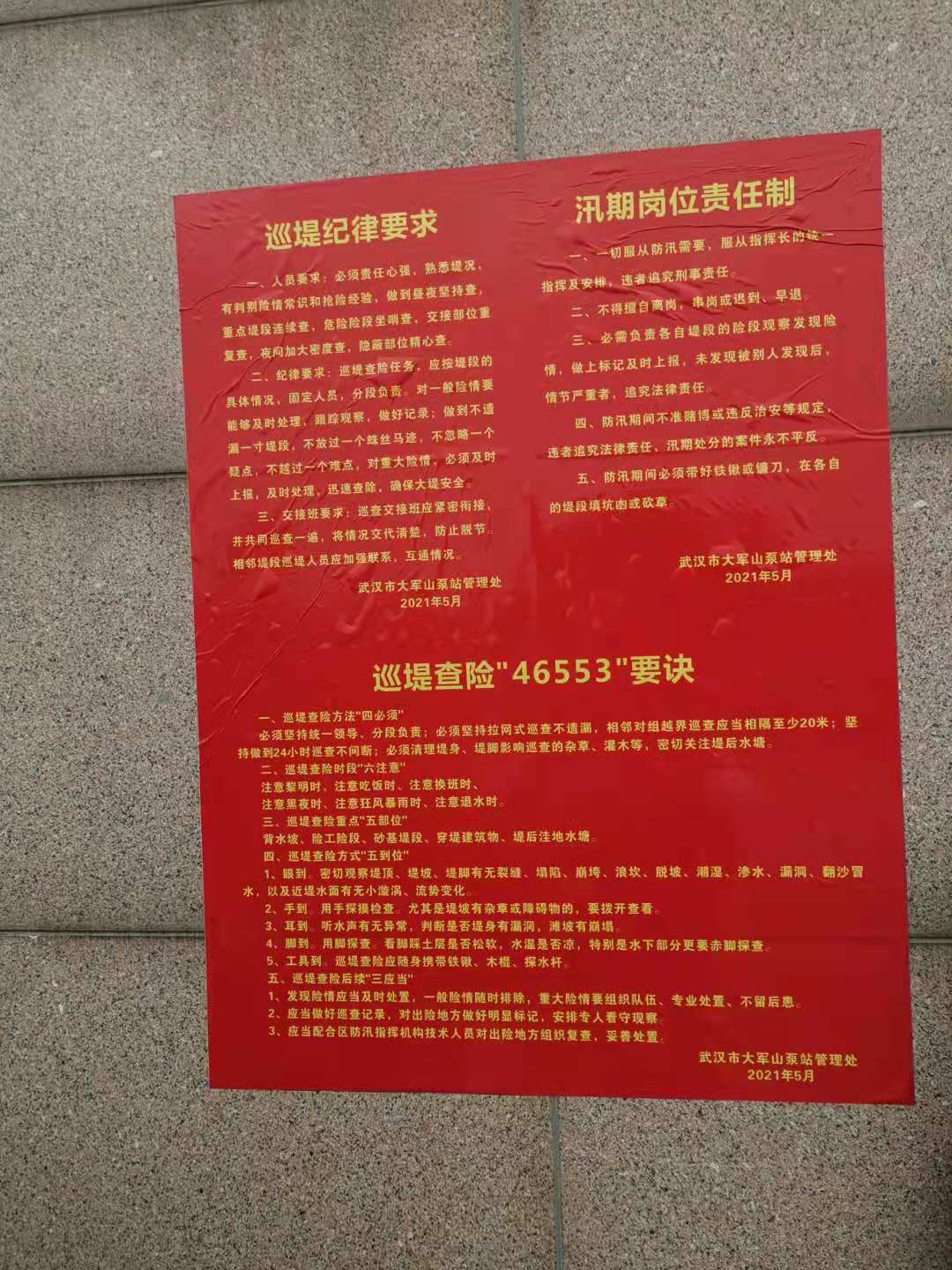 市大军山泵站管理处迅速响应,严格按照城市防洪应急预案职责分工和有关规定,落实各部门和专班组的防汛责任,严格落实值班制度,及时向市防汛抗旱指挥部报送汛情信息,加强堤防防洪设施和重点区域巡查值守,做好防汛排涝工作。按照Ⅳ级响应预案,组织人员对长江干堤专管段内外护坡出杂,搭建帐篷,安排专人上堤巡查、值守,确保防洪安全。