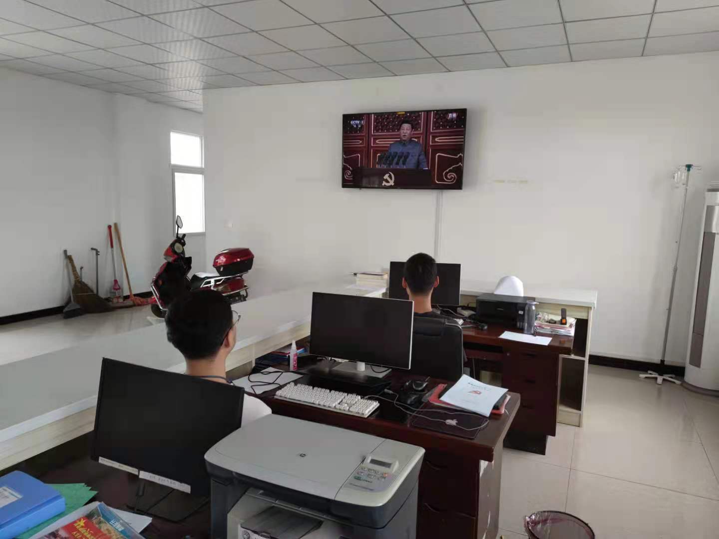 上午8点,大家准时到会,全体党员佩戴党员徽章,大家安静严肃、全神贯注,与现场的同志们共唱国歌,认真聆听习近平总书记讲话。
