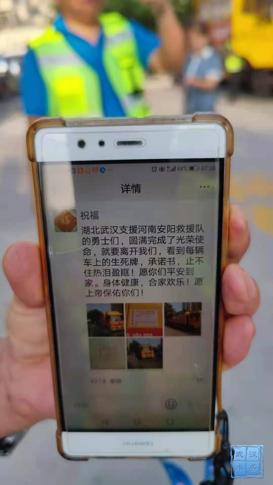 7月31日上午,当地欢送救援队返汉,安阳市委、市政府及当地的有关部门和街道送来锦旗表达谢意;安阳市民自发走上街头,拉起写有“豫鄂一家亲”“一方有难,八方支援”等字样的横幅,夹道为救援队送行。