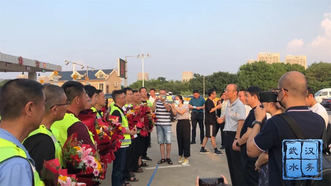 省住建厅二级巡视员张晓曦,武汉市水务局局长周耕等领导同志与全体救援队员逐一握手问候,并献花、合影留念,对湖北武汉排水救援工作给予高度肯定。