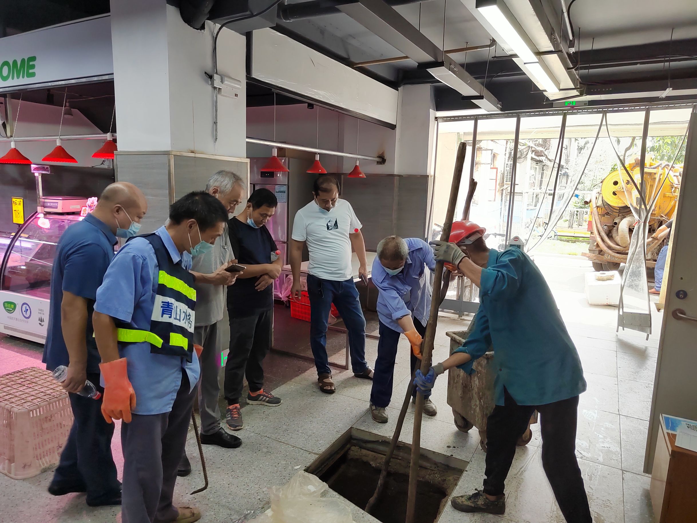 49街菜市场地下管网老旧,原先主要依靠菜市场主管部门购买社会服务解决下水堵塞问题,近期因长年累积,堵塞情况越发严重。该处虽不属于本部门业务管辖范围,但考虑菜场密切关系附近居民日常生活,青山区水务和湖泊局主动作为,为菜场进行了下水道疏通,有效避免了市场内污水漫溢情况,保证了菜场的正常营业、居民菜篮子正常运转。