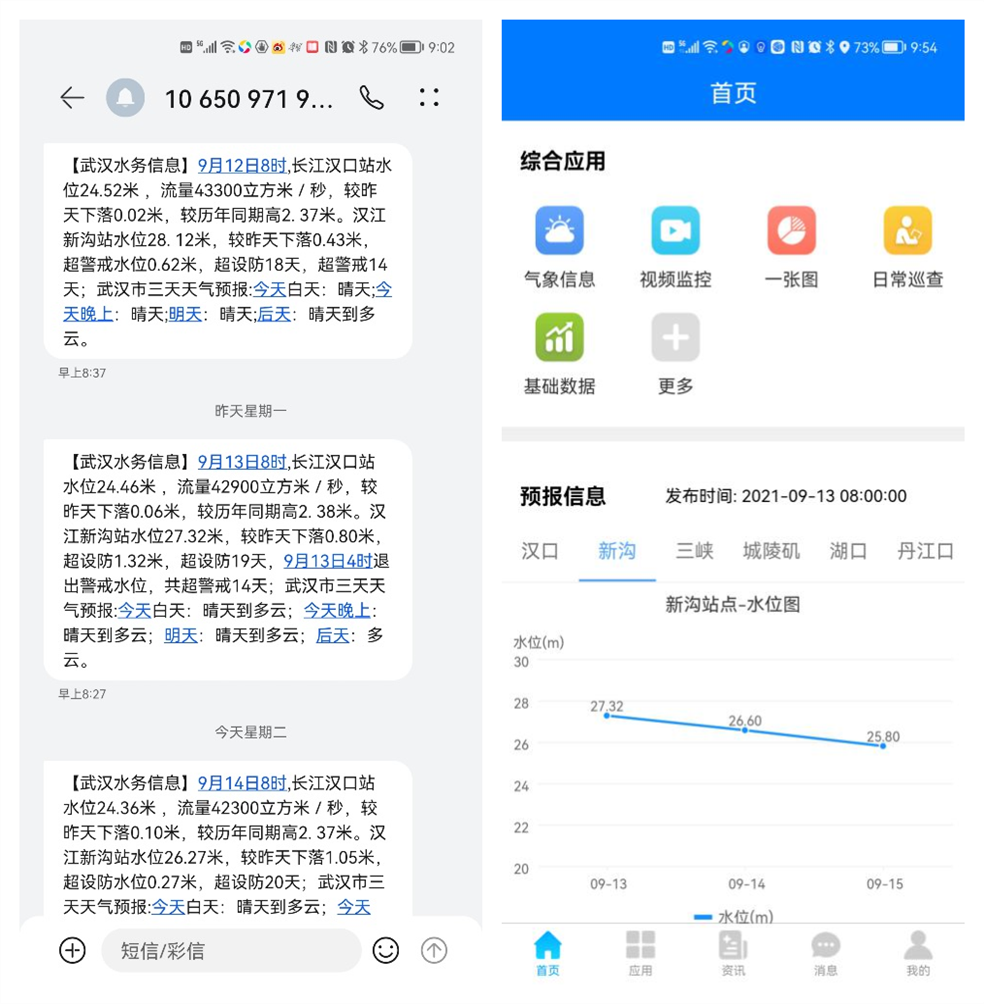 为方便防汛工作人员及时掌握汛情变化,市水务信息中心及时在平台和APP上增加汉江新沟站预报功能,通过智慧水务综合信息管理平台、水务通“APP”推送汉江沿线各站逐时水情、预警预报信息、历史险工段实时视频和每日水雨工情简报,每日通过短信方式推送8时水情,自8月25日以来已发送短信378条、发布水雨工情简报21期。