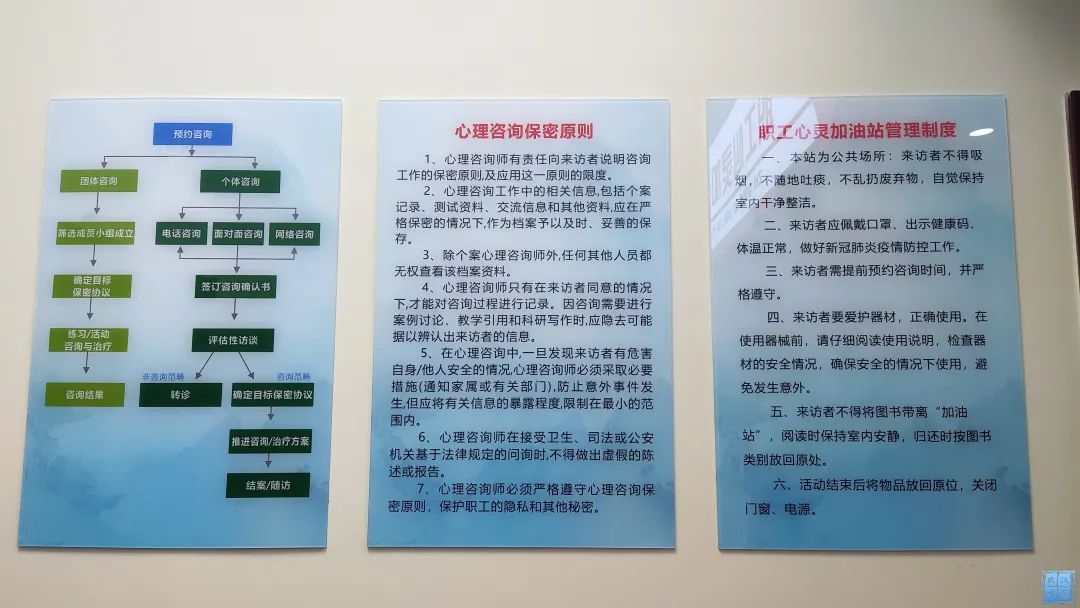 泵站处心灵加油站按照“七有”标准建设(即有场地、有标识、有设施、有经费、有人员、有制度、有活动)。