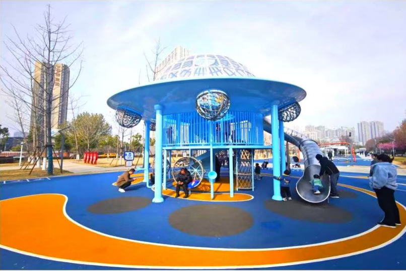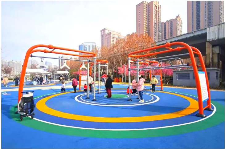 2024年底,市水务局联合市体育局、江岸区水务局,充分利用铁路桥地下净水厂地面空间,打造了金桥体育公园,一座集智能体测、科学健身、趣味竞赛、儿童游乐及篮球、羽毛球、乒乓球等7大功能区于一体的全龄化现代体育公园迅速落成,形成了“头顶打球,脚下治污”复合利用空间,成功打破传统污水处理厂的“邻避”效应,转变为深受群众欢迎的“邻利”工程。自2025年2月体育公园开放以来,累计接待市民40余万人,广受好评,多元的空间设计真正实现了“全龄友好、全民健身”快速融入市民日常生活,成为城市空间更新与生态治理融合的典范。