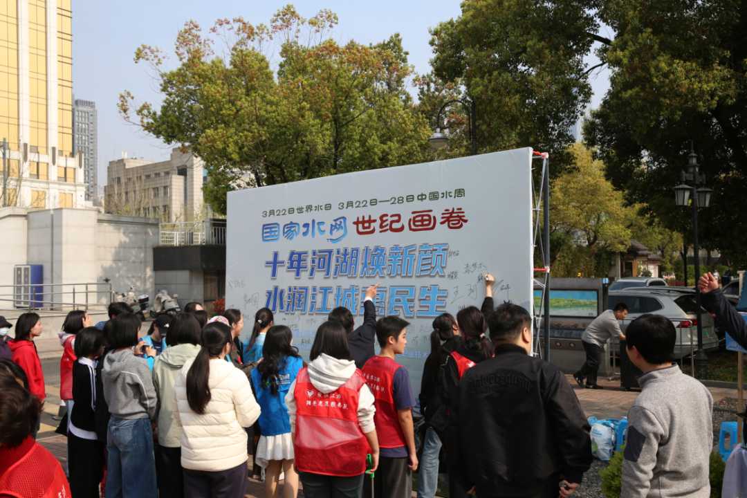 活动现场氛围热烈,主题宣传横幅迎风飘扬,“十年河湖换新颜 水润江城惠民生”签名留言纪念板成为现场核心打卡点,吸引着江滩游客踊跃签名留言,写下了对江城河湖保护的支持与期盼,一笔一划间,尽显全民护水的自觉与热忱,让爱水护水理念从口号变为可触摸、可参与的实际行动。