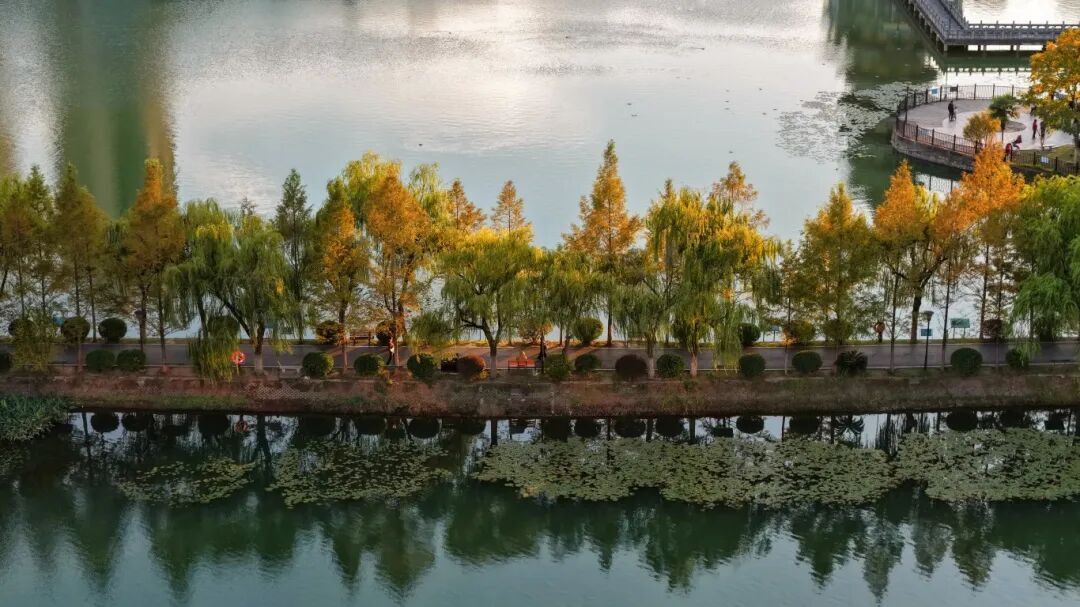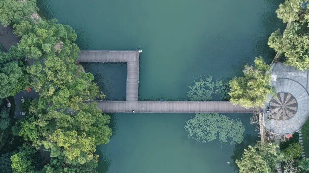 △航拍下的鲩子湖,木栈凌波,绿意拥湖,方寸间藏着都市清宁。