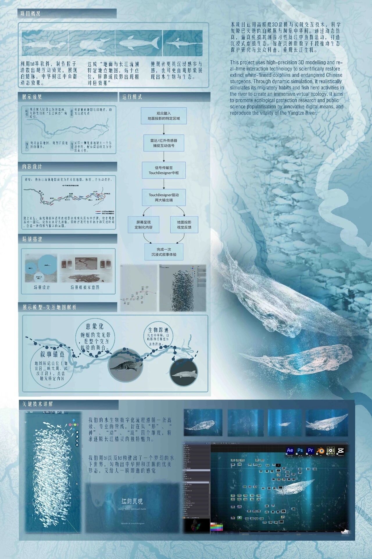 “本项目名为‘江韵灵境’,运用高精度3D建模与实时交互技术,科学复原已灭绝的白鳍豚与濒危中华鲟。通过动态仿真,逼真模拟其洄游习性及江中鱼群活动,打造沉浸式虚拟生态。”