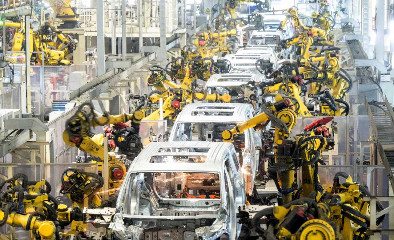 中国车谷,岚图汽车电动化焊装车间机器人在流水线上作业(柯皓|摄)