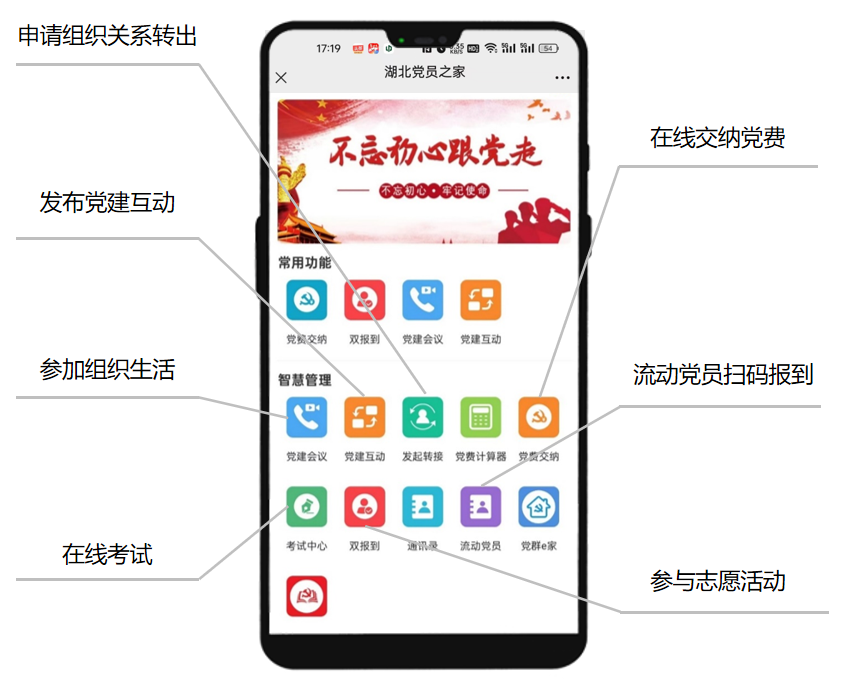 4月上旬,全省党员可通过“荆楚旗帜”微信公众号登录“党员之家”平台移动端,全面启用党费管理、发展党员、党员组织关系转接、流动党员管理等业务功能。
