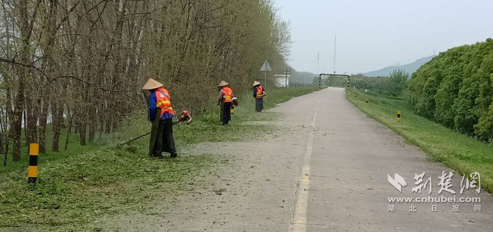 街道组织人员正在对长江干堤11.39公里内外坡的全面除杂。通讯员供图